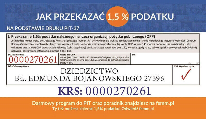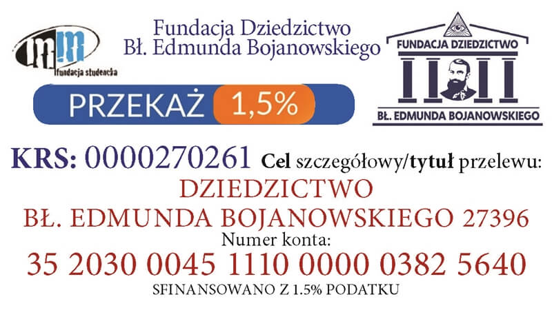 - możesz przekazać 1,5 % podatku na Fundację „Dziedzictwo bł. Edmunda Bojanowskiego” KRS 0000270261,