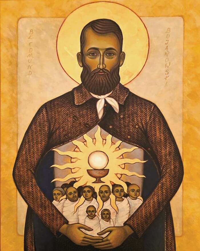 Płaszcz Edmunda, rozchylony, ujawniający to, co ukryte, zwraca uwagę na jeszcze jeden aspekt. Siła Edmunda do niesienia pomocy ludziom, bycia im w najgłębszym sensie ojcem, nie jest jego własną mocą. Jej źródłem jest EUCHARYSTIA.